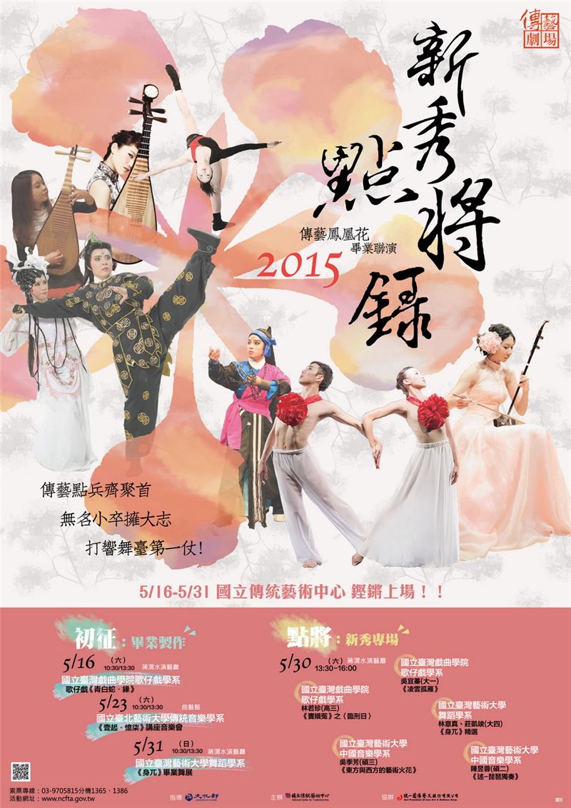 由文化部指導、國立傳統藝術中心主辦的「2015傳藝鳳凰花畢業聯演」即將在5月16日起至5月31日止,每周末在傳藝中心登場!除了展現莘莘學子對傳統藝術的熱血執著與當代詮釋,加上今年為各領域新秀開闢「新秀專場」之專屬舞臺,邀請您一同見證這群傳統藝術生力軍的精彩與努力,驚喜喝采傳統藝術的青春奔放和無限可能!